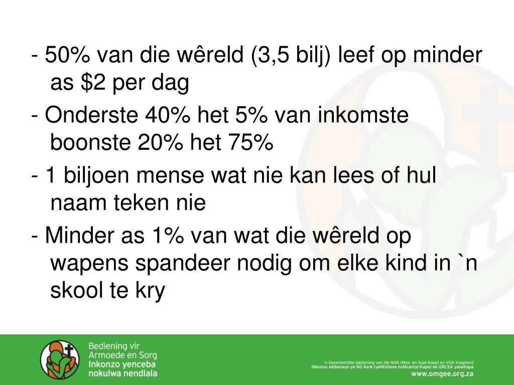Statistiek - 50% van die wêreld (3,5 bilj) leef op minder as $2 per dag - Onderste 40% het 5% van inkomste boonste 20% het 75% - 1 biljoen mense wat nie kan lees of hul naam teken nie - Minder as 1% van wat die wêreld op wapens spandeer nodig om elke kind in `n skool te kry