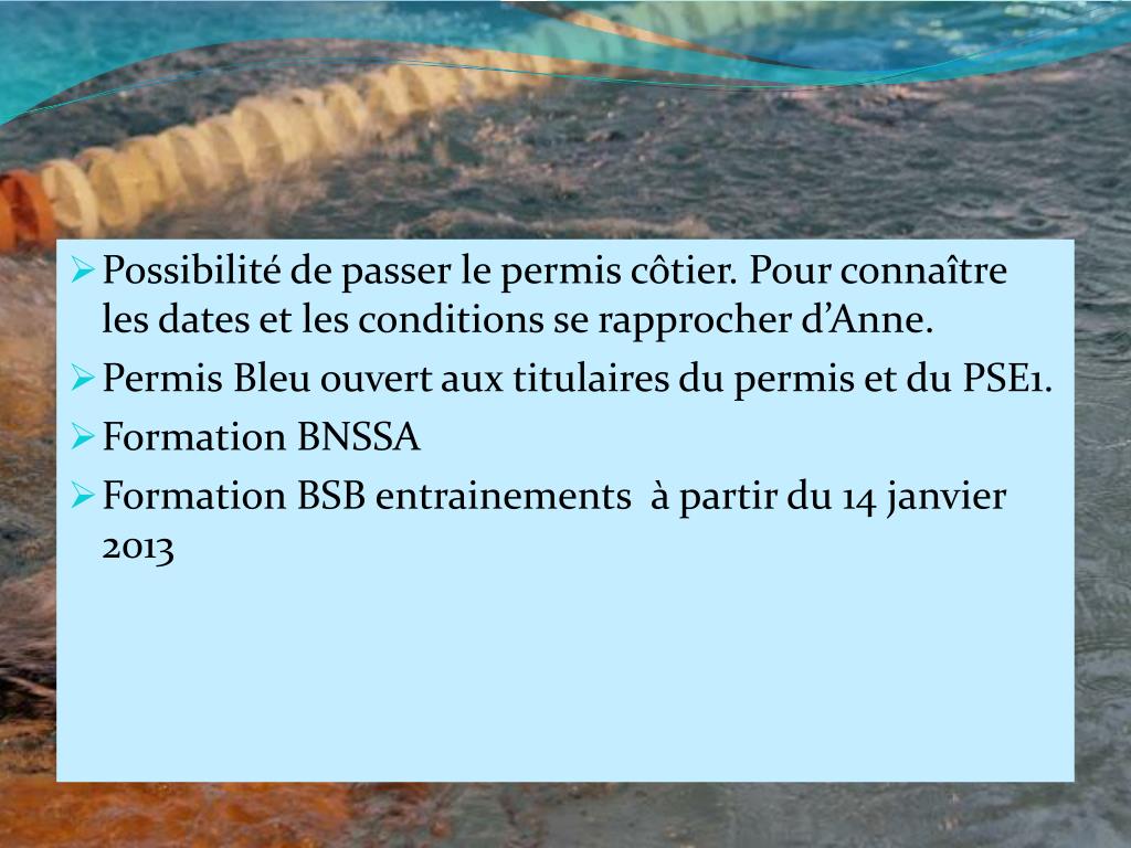 Possibilité de passer le permis côtier. Pour connaître les dates et les conditions se rapprocher d’Anne. • Permis Bleu ouvert aux titulaires du permis et du PSE1. • Formation BNSSA • Formation BSB entrainements à partir du 14 janvier 2013