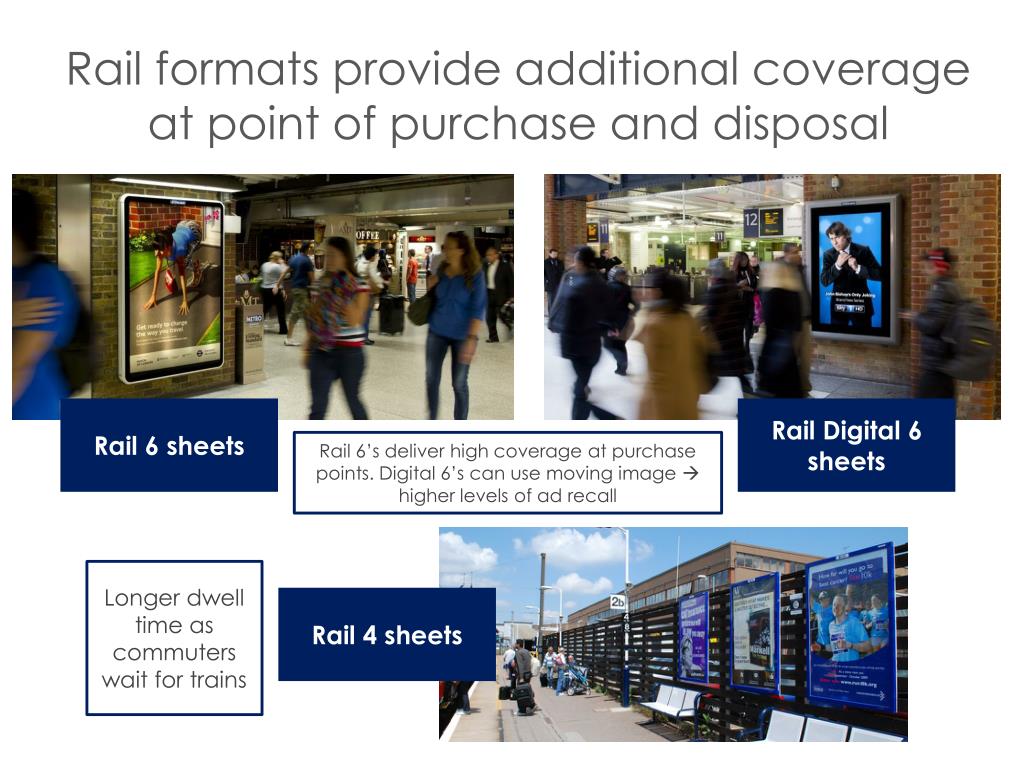 Rail formats provide additional coverage at point of purchase and disposal Rail 6 sheets Rail Digital 6 sheets Rail 6’s deliver high coverage at purchase points. Digital 6’s can use moving image higher levels of ad recall Longer dwell time as commuters wait for trains Rail 4 sheets