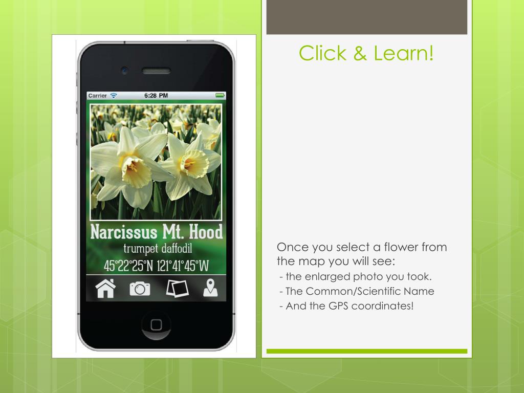 Click & Learn! Once you select a flower from the map you will see: - the enlarged photo you took. - The Common/Scientific Name - And the GPS coordinates!