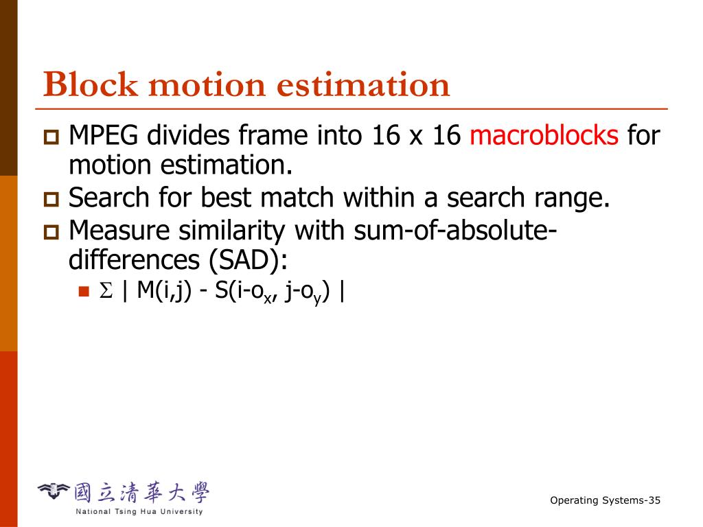 Block motion estimation • MPEG divides frame into 16 x 16 macroblocks for motion estimation. • Search for best match within a search range. • Measure similarity with sum-of-absolute-differences (SAD): • S | M(i,j) - S(i-ox, j-oy) |