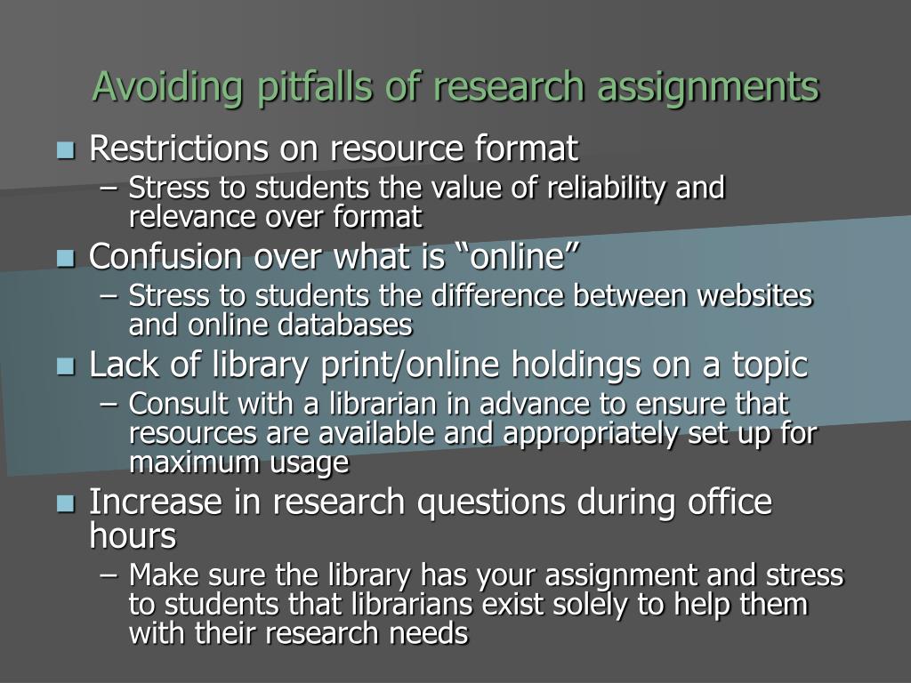 Avoiding pitfalls of research assignments • Restrictions on resource format • Stress to students the value of reliability and relevance over format • Confusion over what is “online” • Stress to students the difference between websites and online databases • Lack of library print/online holdings on a topic • Consult with a librarian in advance to ensure that resources are available and appropriately set up for maximum usage • Increase in research questions during office hours • Make sure the library has your assignment and stress to students that librarians exist solely to help them with their research needs