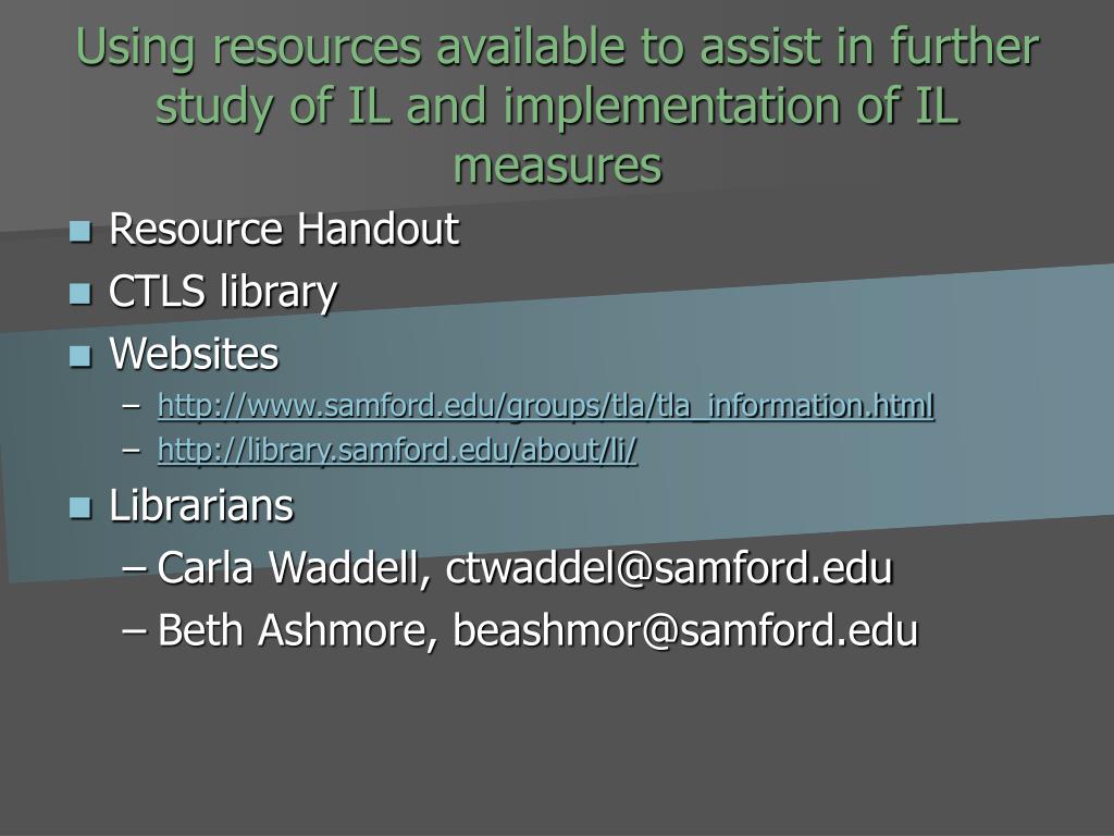 Using resources available to assist in further study of IL and implementation of IL measures • Resource Handout • CTLS library • Websites • http://www.samford.edu/groups/tla/tla_information.html • http://library.samford.edu/about/li/ • Librarians • Carla Waddell, ctwaddel@samford.edu • Beth Ashmore, beashmor@samford.edu