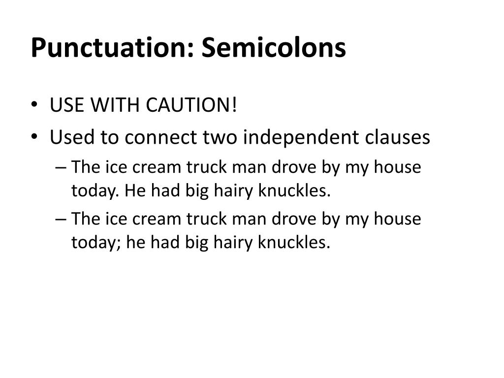 Punctuation: Semicolons • USE WITH CAUTION! • Used to connect two independent clauses • The ice cream truck man drove by my house today. He had big hairy knuckles. • The ice cream truck man drove by my house today; he had big hairy knuckles.