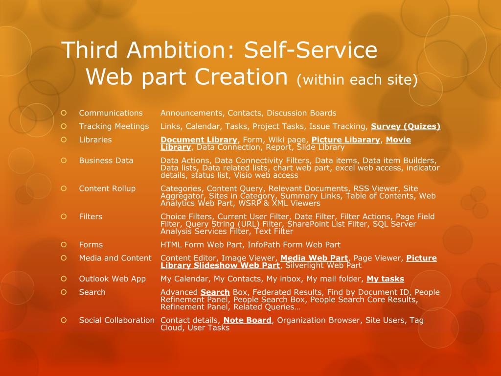 Third Ambition: Self-Service Web part Creation (within each site) • Communications Announcements, Contacts, Discussion Boards • Tracking Meetings Links, Calendar, Tasks, Project Tasks, Issue Tracking, Survey (Quizes) • Libraries Document Library, Form, Wiki page, Picture Libarary, MovieLibrary, Data Connection, Report, Slide Library • Business Data Data Actions, Data Connectivity Filters, Data items, Data item Builders, Data lists, Data related lists, chart web part, excel web access, indicator details, status list, Visio web access • Content Rollup Categories, Content Query, Relevant Documents, RSS Viewer, Site Aggregator, Sites in Category, Summary Links, Table of Contents, Web Analytics Web Part, WSRP & XML Viewers • Filters Choice Filters, Current User Filter, Date Filter, Filter Actions, Page Field Filter, Query String (URL) Filter, SharePoint List Filter, SQL Server Analysis Services Filter, Text Filter • Forms HTML Form Web Part, InfoPath Form Web Part • Media and Content Content Editor, Image Viewer, Media Web Part, Page Viewer, Picture Library Slideshow Web Part, Silverlight Web Part • Outlook Web App My Calendar, My Contacts, My inbox, My mail folder, My tasks • Search Advanced Search Box, Federated Results, Find by Document ID, People Refinement Panel, People Search Box, People Search Core Results, Refinement Panel, Related Queries… • Social Collaboration Contact details, Note Board, Organization Browser, Site Users, Tag Cloud, User Tasks