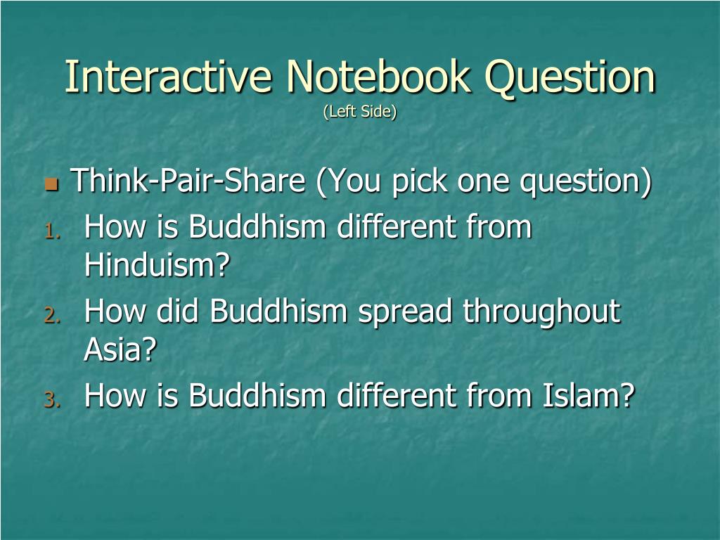 Interactive Notebook Question (Left Side) • Think-Pair-Share (You pick one question) • How is Buddhism different from Hinduism? • How did Buddhism spread throughout Asia? • How is Buddhism different from Islam?