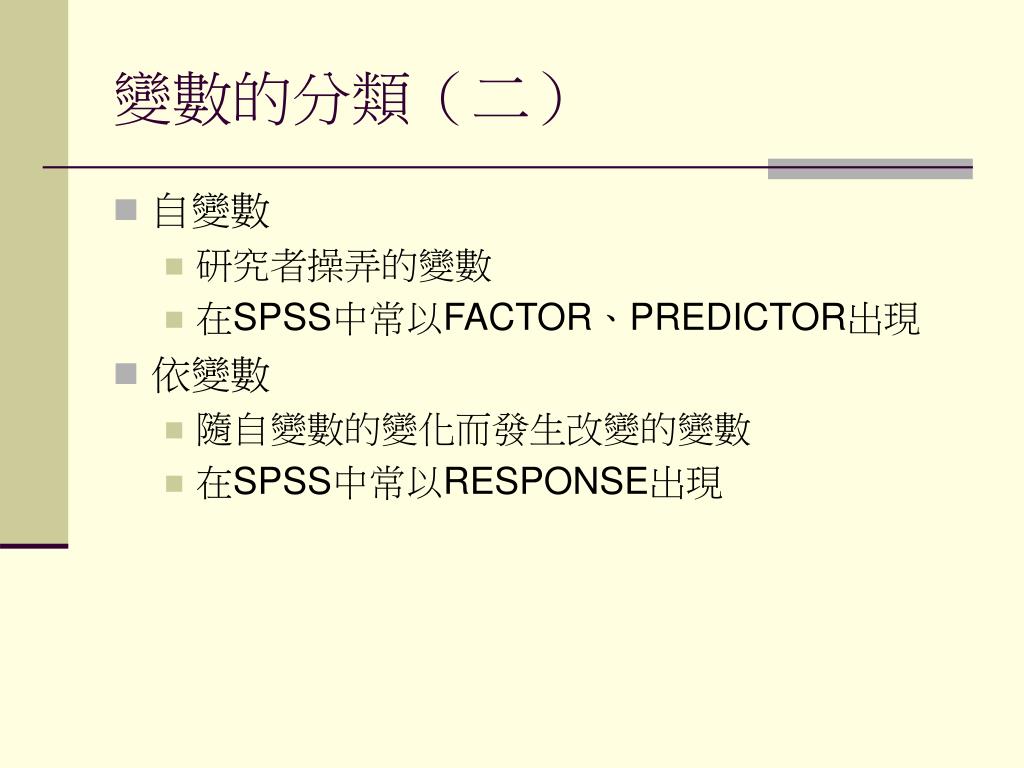 變數的分類(二) • 自變數 • 研究者操弄的變數 • 在SPSS中常以FACTOR、PREDICTOR出現 • 依變數 • 隨自變數的變化而發生改變的變數 • 在SPSS中常以RESPONSE出現