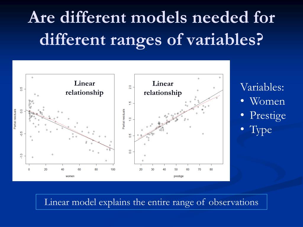 Are different models needed for different ranges of variables? Linear relationship Linear relationship • Variables: • Women • Prestige • Type Linear model explains the entire range of observations
