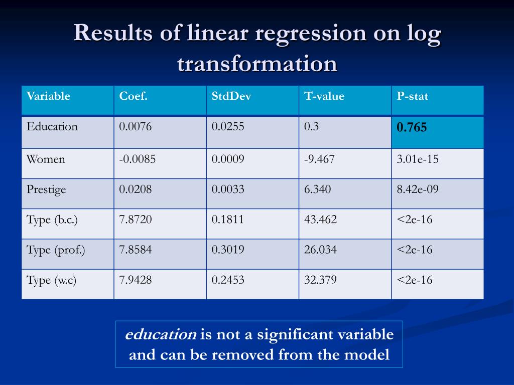 Results of linear regression on log transformation education is not a significant variable and can be removed from the model