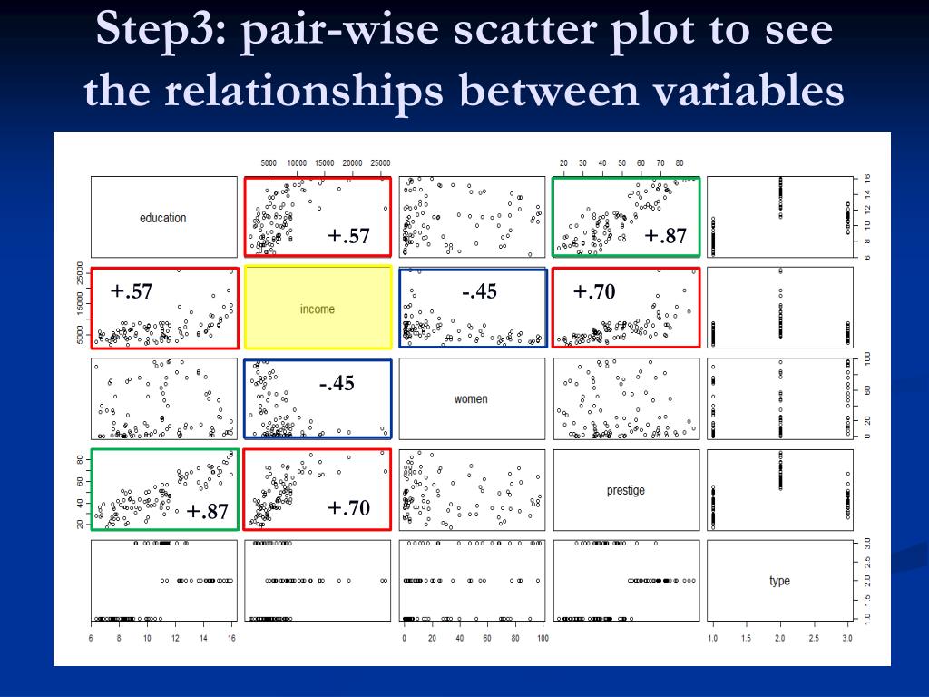 Step3: pair-wise scatter plot to see the relationships between variables +.57 +.87 +.57 -.45 +.70 -.45 +.70 +.87