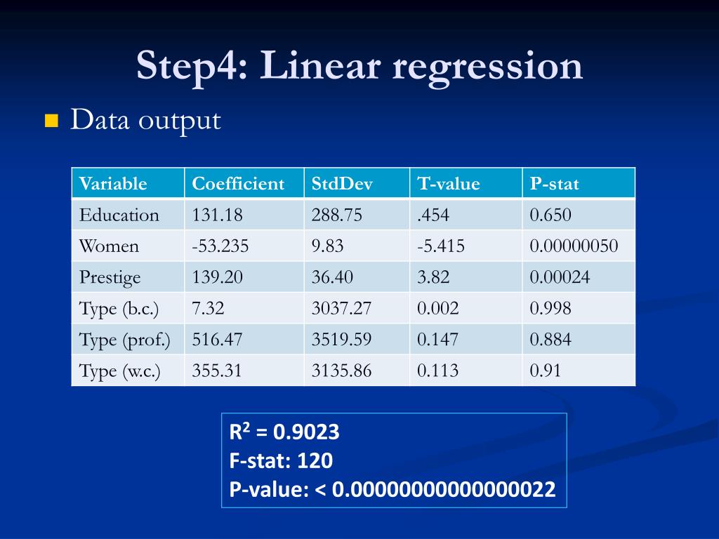 Step4: Linear regression • Data output R2 = 0.9023 F-stat: 120 P-value: < 0.00000000000000022