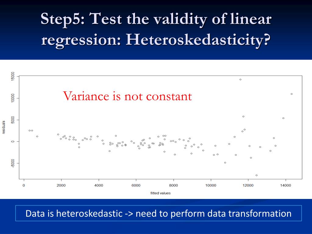 Step5: Test the validity of linear regression: Heteroskedasticity? Variance is not constant R2 = .90 Data is heteroskedastic -> need to perform data transformation