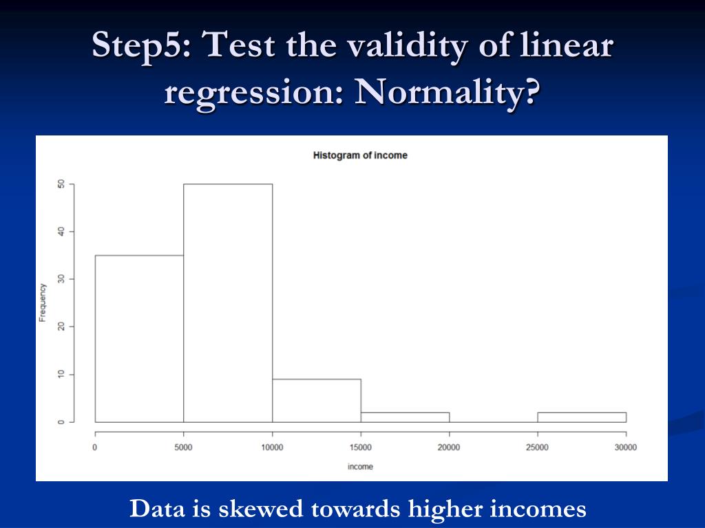 Step5: Test the validity of linear regression: Normality? Data is skewed towards higher incomes