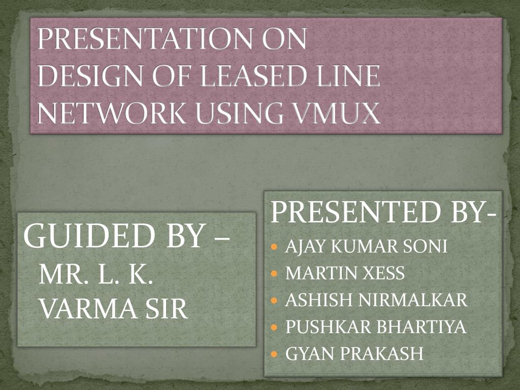 PRESENTATION ON DESIGN OF LEASED LINE NETWORK USING VMUX GUIDED BY – MR. L. K. VARMA SIR PRESENTED BY- • AJAY KUMAR SONI • MARTIN XESS • ASHISH NIRMALKAR • PUSHKAR BHARTIYA • GYAN PRAKASH