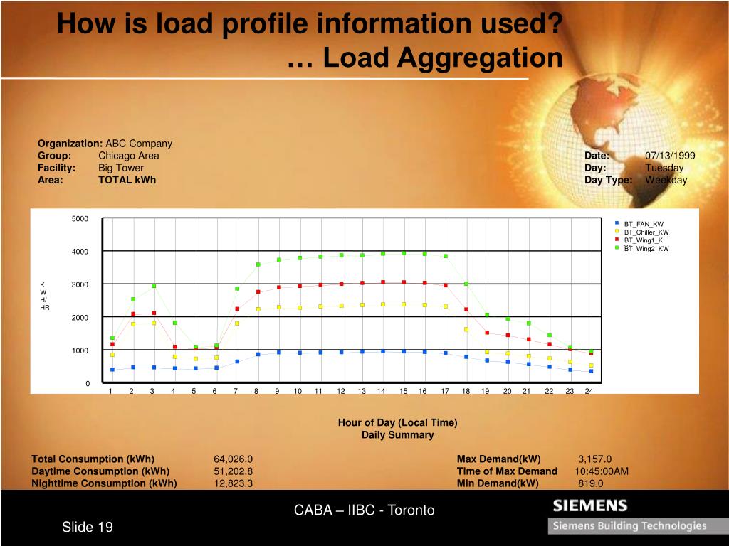 How is load profile information used? … Load Aggregation Organization: ABC Company Group: Chicago Area Date: 07/13/1999 Facility: Big Tower Day: Tuesday Area: TOTAL kWhDay Type: Weekday Hour of Day (Local Time) Daily Summary Total Consumption (kWh) 64,026.0 Max Demand(kW) 3,157.0 Daytime Consumption (kWh) 51,202.8 Time of Max Demand 10:45:00AM Nighttime Consumption (kWh) 12,823.3 Min Demand(kW) 819.0 Load Factor 0.85 CABA – IIBC - Toronto