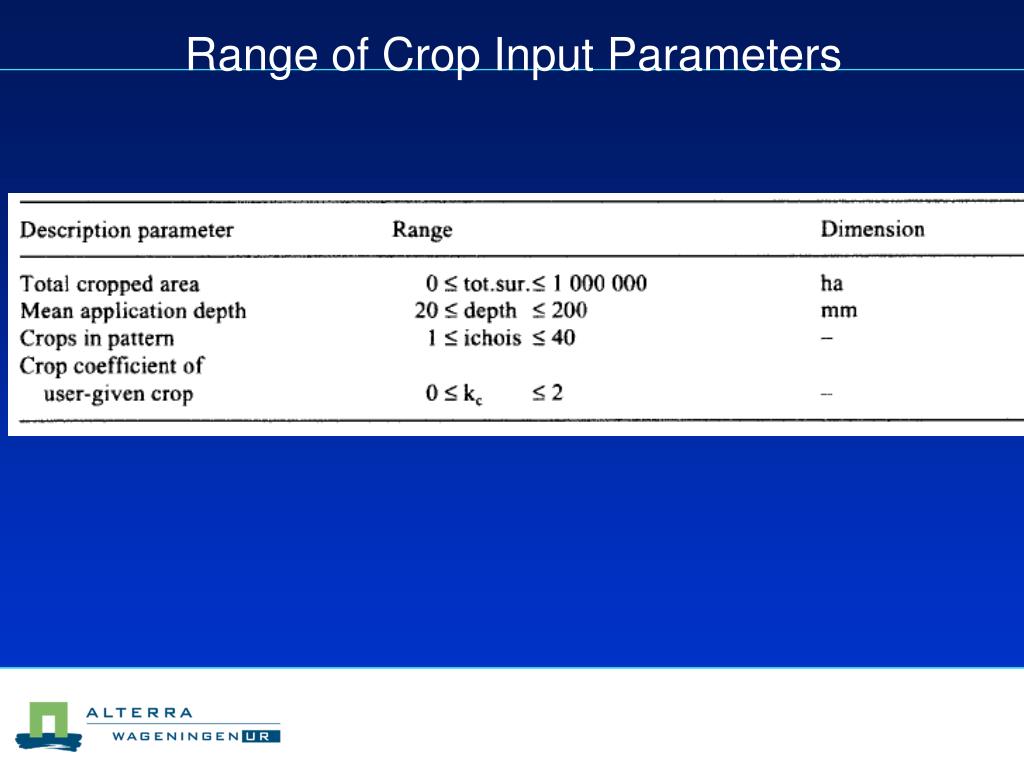 Influencing factors in Criwar The following factors have effect on the water requirement of a crop: • The climate • The type of crop • The growth stage of the crop