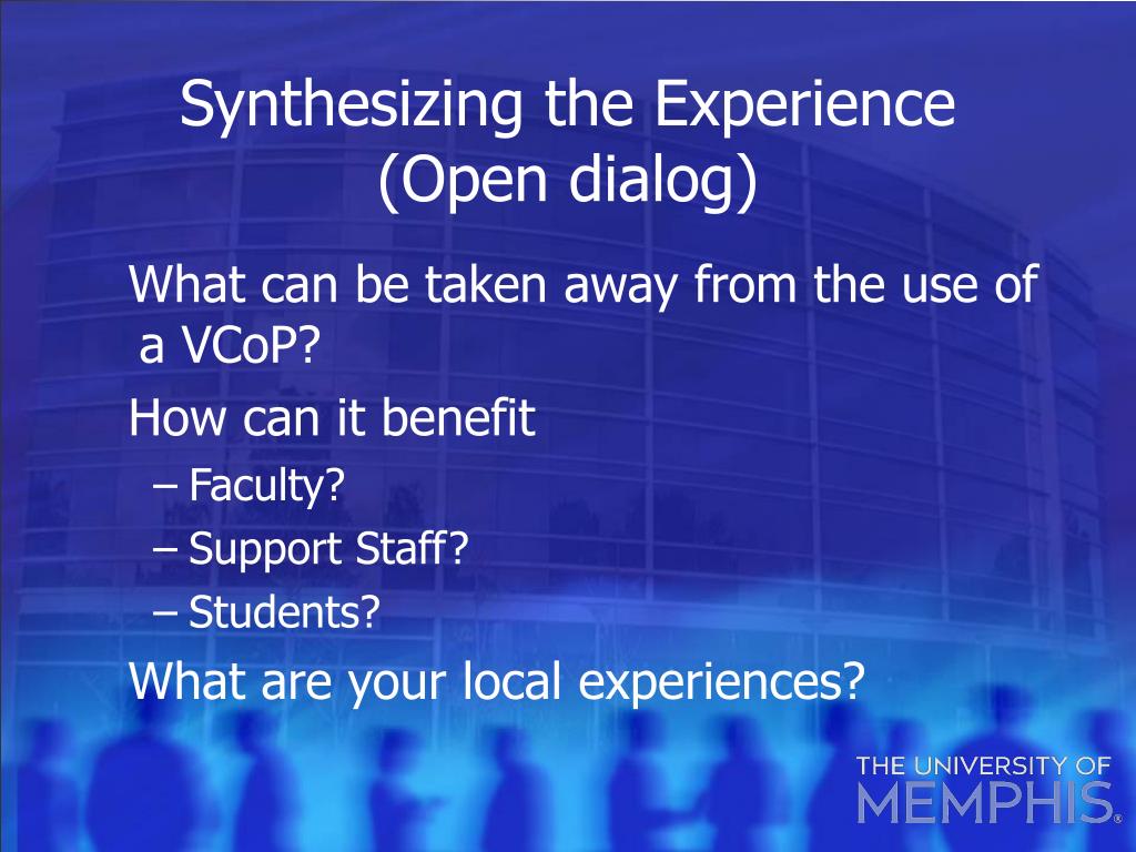 What can be taken away from the use of a VCoP? How can it benefit Faculty? Support Staff? Students? What are your local experiences? Synthesizing the Experience(Open dialog)