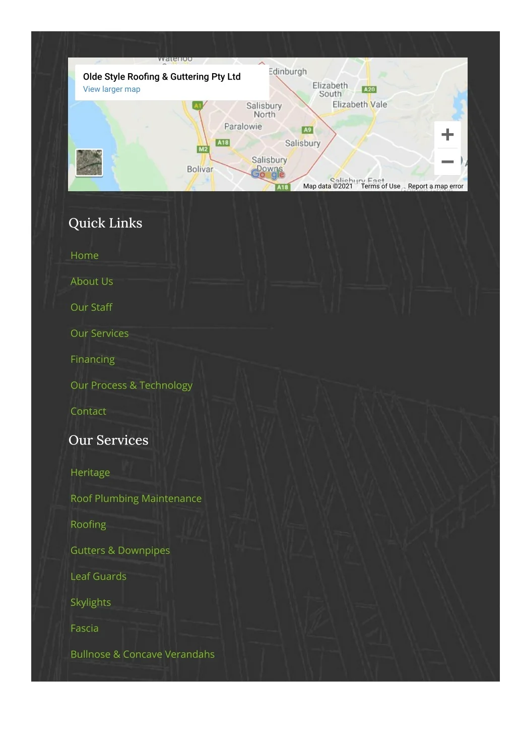 Olde Style Roo몭ng & Guttering Pty Ltd View larger map Map data ©2021 Terms of Use Report a map error Quick Links Home About Us Our Sta몭 Our Services Financing Our Process & Technology Contact Our Services Heritage Roof Plumbing Maintenance Roo몭ng Gutters & Downpipes Leaf Guards Skylights Fascia Bullnose & Concave Verandahs