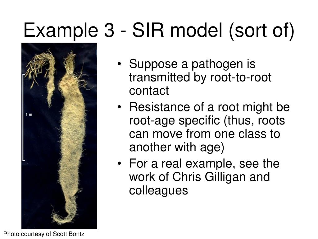 Example 3 - SIR model (sort of) • Suppose a pathogen is transmitted by root-to-root contact • Resistance of a root might be root-age specific (thus, roots can move from one class to another with age) • For a real example, see the work of Chris Gilligan and colleagues Photo courtesy of Scott Bontz