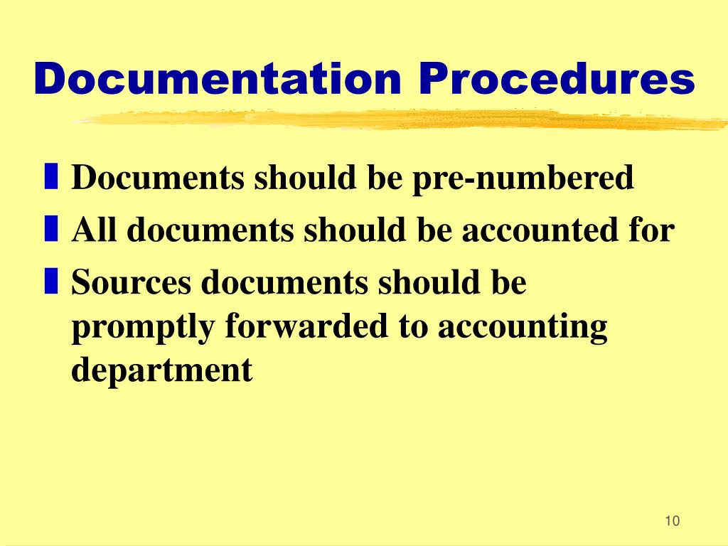 Documentation Procedures • Documents should be pre-numbered • All documents should be accounted for • Sources documents should be promptly forwarded to accounting department