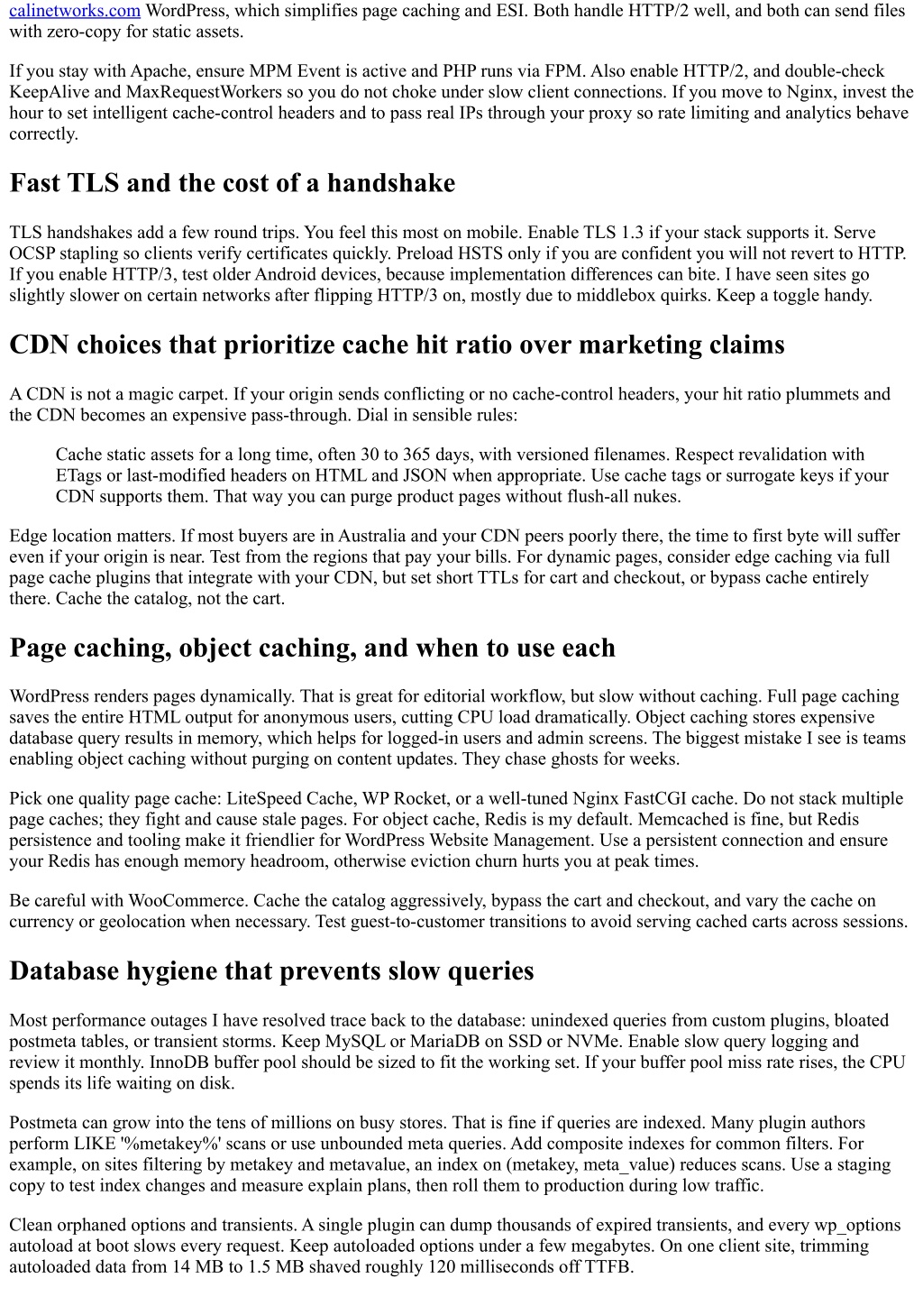 calinetworks.com WordPress, which simplifies page caching and ESI. Both handle HTTP/2 well, and both can send files with zero-copy for static assets. If you stay with Apache, ensure MPM Event is active and PHP runs via FPM. Also enable HTTP/2, and double-check KeepAlive and MaxRequestWorkers so you do not choke under slow client connections. If you move to Nginx, invest the hour to set intelligent cache-control headers and to pass real IPs through your proxy so rate limiting and analytics behave correctly. Fast TLS and the cost of a handshake TLS handshakes add a few round trips. You feel this most on mobile. Enable TLS 1.3 if your stack supports it. Serve OCSP stapling so clients verify certificates quickly. Preload HSTS only if you are confident you will not revert to HTTP. If you enable HTTP/3, test older Android devices, because implementation differences can bite. I have seen sites go slightly slower on certain networks after flipping HTTP/3 on, mostly due to middlebox quirks. Keep a toggle handy. CDN choices that prioritize cache hit ratio over marketing claims A CDN is not a magic carpet. If your origin sends conflicting or no cache-control headers, your hit ratio plummets and the CDN becomes an expensive pass-through. Dial in sensible rules: Cache static assets for a long time, often 30 to 365 days, with versioned filenames. Respect revalidation with ETags or last-modified headers on HTML and JSON when appropriate. Use cache tags or surrogate keys if your CDN supports them. That way you can purge product pages without flush-all nukes. Edge location matters. If most buyers are in Australia and your CDN peers poorly there, the time to first byte will suffer even if your origin is near. Test from the regions that pay your bills. For dynamic pages, consider edge caching via full page cache plugins that integrate with your CDN, but set short TTLs for cart and checkout, or bypass cache entirely there. Cache the catalog, not the cart. Page caching, object caching, and when to use each WordPress renders pages dynamically. That is great for editorial workflow, but slow without caching. Full page caching saves the entire HTML output for anonymous users, cutting CPU load dramatically. Object caching stores expensive database query results in memory, which helps for logged-in users and admin screens. The biggest mistake I see is teams enabling object caching without purging on content updates. They chase ghosts for weeks. Pick one quality page cache: LiteSpeed Cache, WP Rocket, or a well-tuned Nginx FastCGI cache. Do not stack multiple page caches; they fight and cause stale pages. For object cache, Redis is my default. Memcached is fine, but Redis persistence and tooling make it friendlier for WordPress Website Management. Use a persistent connection and ensure your Redis has enough memory headroom, otherwise eviction churn hurts you at peak times. Be careful with WooCommerce. Cache the catalog aggressively, bypass the cart and checkout, and vary the cache on currency or geolocation when necessary. Test guest-to-customer transitions to avoid serving cached carts across sessions. Database hygiene that prevents slow queries Most performance outages I have resolved trace back to the database: unindexed queries from custom plugins, bloated postmeta tables, or transient storms. Keep MySQL or MariaDB on SSD or NVMe. Enable slow query logging and review it monthly. InnoDB buffer pool should be sized to fit the working set. If your buffer pool miss rate rises, the CPU spends its life waiting on disk. Postmeta can grow into the tens of millions on busy stores. That is fine if queries are indexed. Many plugin authors perform LIKE '%metakey%' scans or use unbounded meta queries. Add composite indexes for common filters. For example, on sites filtering by metakey and metavalue, an index on (metakey, meta_value) reduces scans. Use a staging copy to test index changes and measure explain plans, then roll them to production during low traffic. Clean orphaned options and transients. A single plugin can dump thousands of expired transients, and every wp_options autoload at boot slows every request. Keep autoloaded options under a few megabytes. On one client site, trimming autoloaded data from 14 MB to 1.5 MB shaved roughly 120 milliseconds off TTFB.