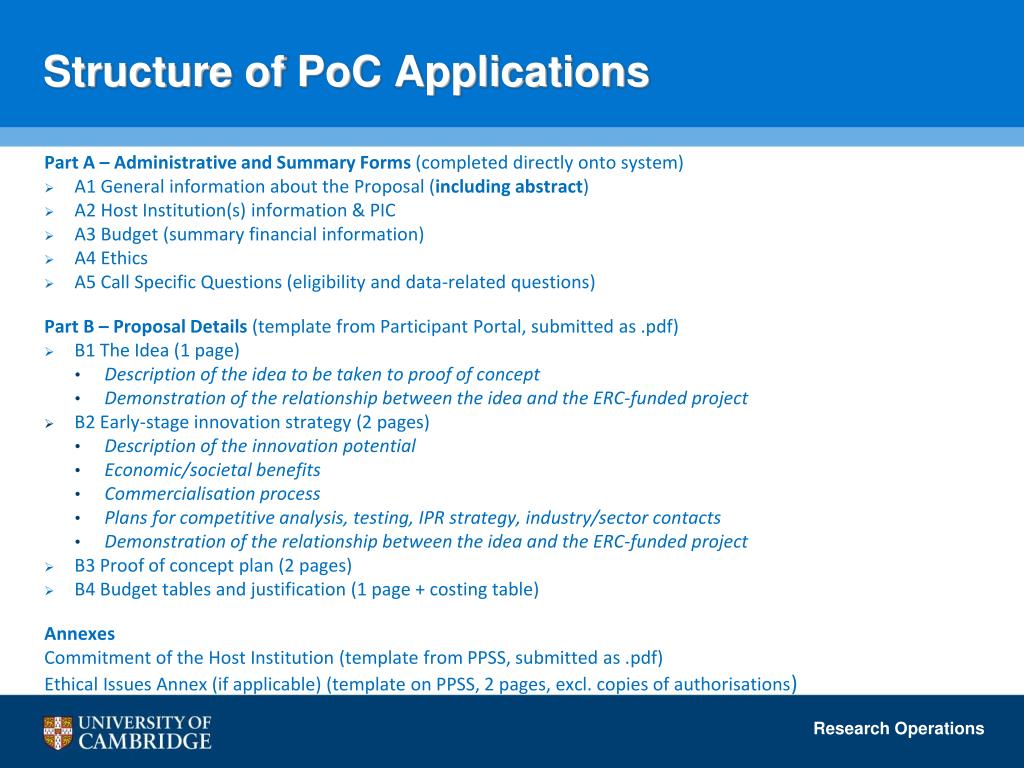 Structure of PoC Applications Part A – Administrative and Summary Forms (completed directly onto system) • A1 General information about the Proposal (including abstract) • A2 Host Institution(s) information & PIC • A3 Budget (summary financial information) • A4 Ethics • A5 Call Specific Questions (eligibility and data-related questions) Part B – Proposal Details (template from Participant Portal, submitted as .pdf) • B1 The Idea (1 page) • Description of the idea to be taken to proof of concept • Demonstration of the relationship between the idea and the ERC-funded project • B2 Early-stage innovation strategy (2 pages) • Description of the innovation potential • Economic/societal benefits • Commercialisation process • Plans for competitive analysis, testing, IPR strategy, industry/sector contacts • Demonstration of the relationship between the idea and the ERC-funded project • B3 Proof of concept plan (2 pages) • B4 Budget tables and justification (1 page + costing table) Annexes Commitment of the Host Institution (template from PPSS, submitted as .pdf)Ethical Issues Annex (if applicable) (template on PPSS, 2 pages, excl. copies of authorisations)
