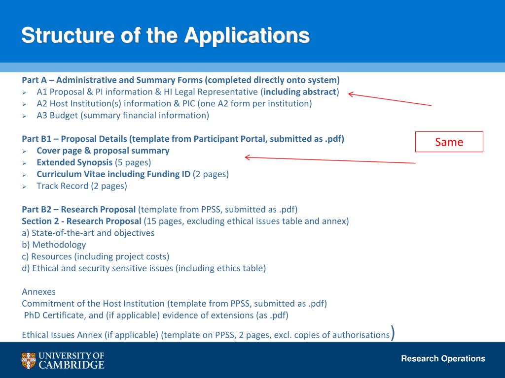 Structure of the Applications Part A – Administrative and Summary Forms (completed directly onto system) • A1 Proposal & PI information & HI Legal Representative (including abstract) • A2 Host Institution(s) information & PIC (one A2 form per institution) • A3 Budget (summary financial information) Part B1 – Proposal Details (template from Participant Portal, submitted as .pdf) • Cover page & proposal summary • Extended Synopsis (5 pages) • Curriculum Vitae including Funding ID (2 pages) • Track Record (2 pages) Part B2 – Research Proposal (template from PPSS, submitted as .pdf) Section 2 - Research Proposal (15 pages, excluding ethical issues table and annex) a) State-of-the-art and objectives b) Methodology c) Resources (including project costs) d) Ethical and security sensitive issues (including ethics table) Annexes Commitment of the Host Institution (template from PPSS, submitted as .pdf) PhD Certificate, and (if applicable) evidence of extensions (as .pdf) Ethical Issues Annex (if applicable) (template on PPSS, 2 pages, excl. copies of authorisations) Same