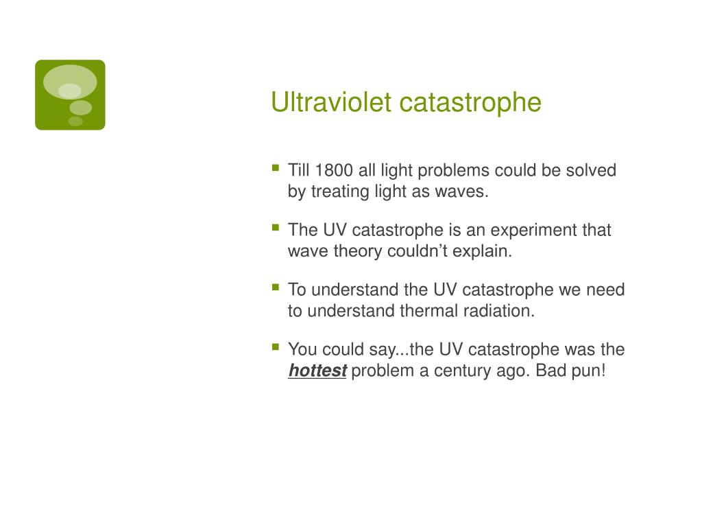 Ultraviolet catastrophe Till 1800 all light problems could be solved by treating light as waves. The UV catastrophe is an experiment that wave theory couldn’t explain. To understand the UV catastrophe we need to understand thermal radiation. You could say...the UV catastrophe was the hottest problem a century ago. Bad pun!