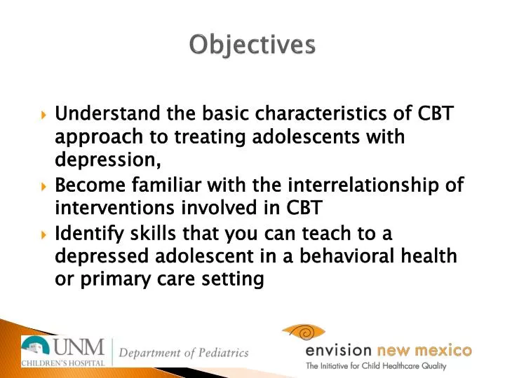 Objectives • Understand the basic characteristics of CBT approach to treating adolescents with depression, • Become familiar with the interrelationship of interventions involved in CBT • Identify skills that you can teach to a depressed adolescent in a behavioral health or primary care setting