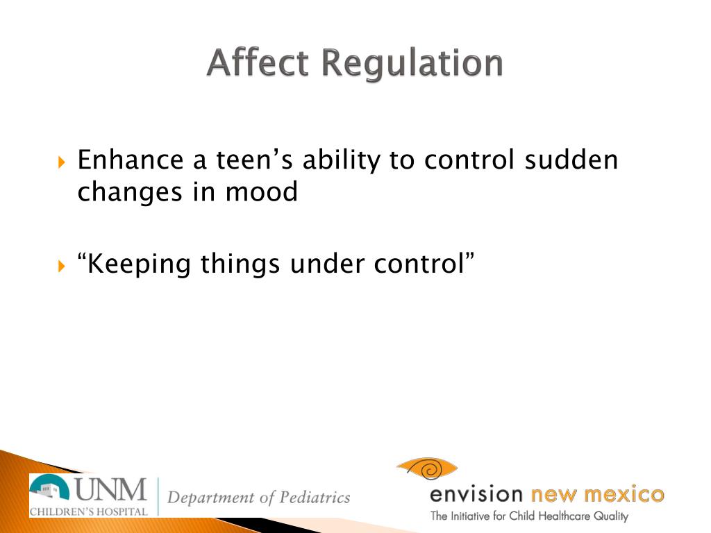 Affect Regulation • Enhance a teen’s ability to control sudden changes in mood • “Keeping things under control”