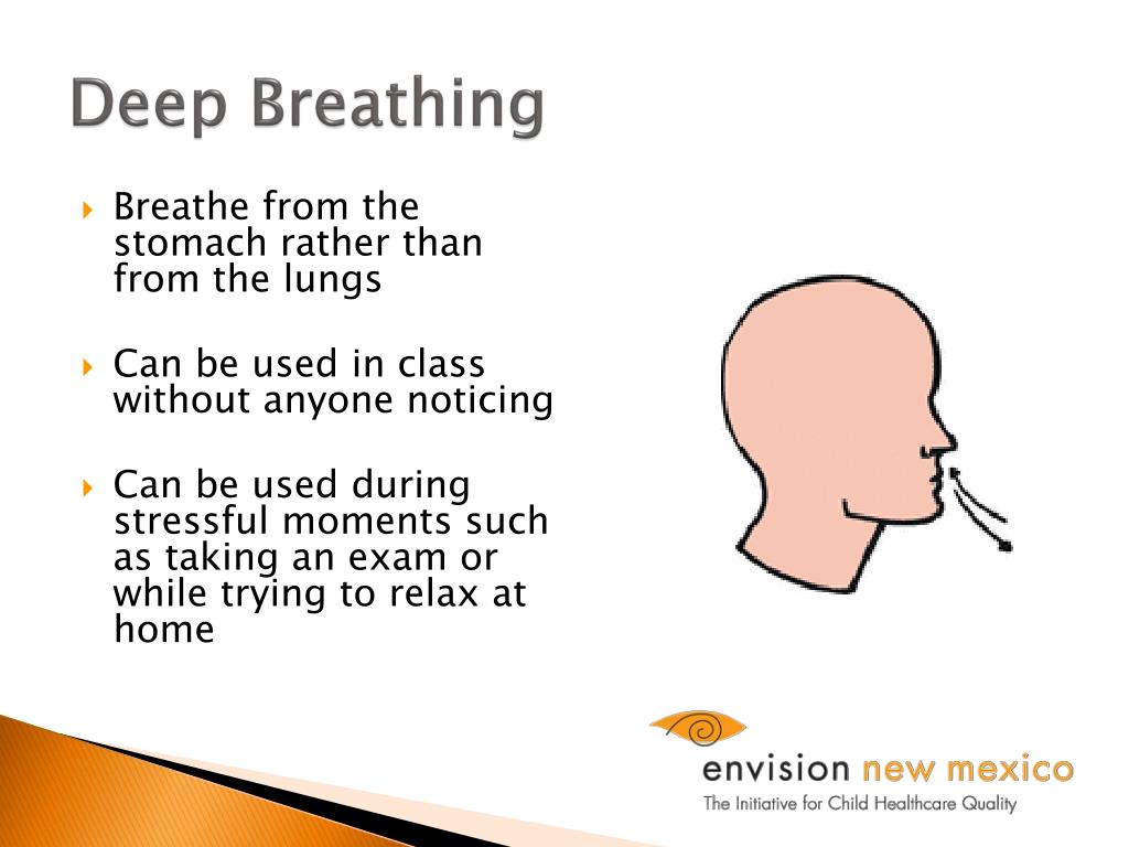 Deep Breathing • Breathe from the stomach rather than from the lungs • Can be used in class without anyone noticing • Can be used during stressful moments such as taking an exam or while trying to relax at home