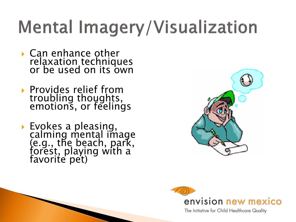 Mental Imagery/Visualization • Can enhance other relaxation techniques or be used on its own • Provides relief from troubling thoughts, emotions, or feelings • Evokes a pleasing, calming mental image (e.g., the beach, park, forest, playing with a favorite pet)