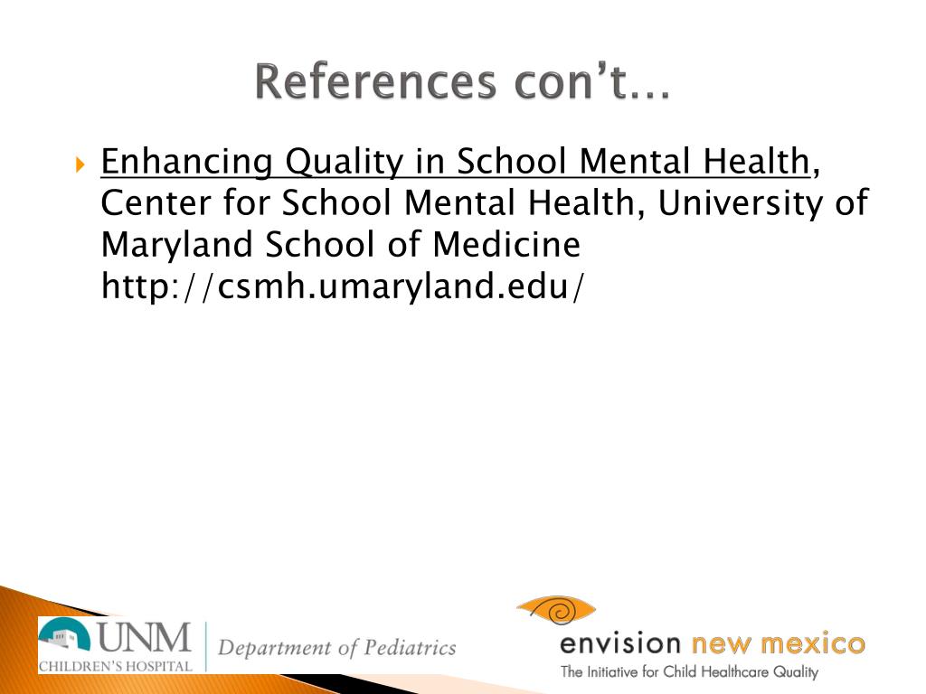 References con’t… • Enhancing Quality in School Mental Health, Center for School Mental Health, University of Maryland School of Medicine http://csmh.umaryland.edu/