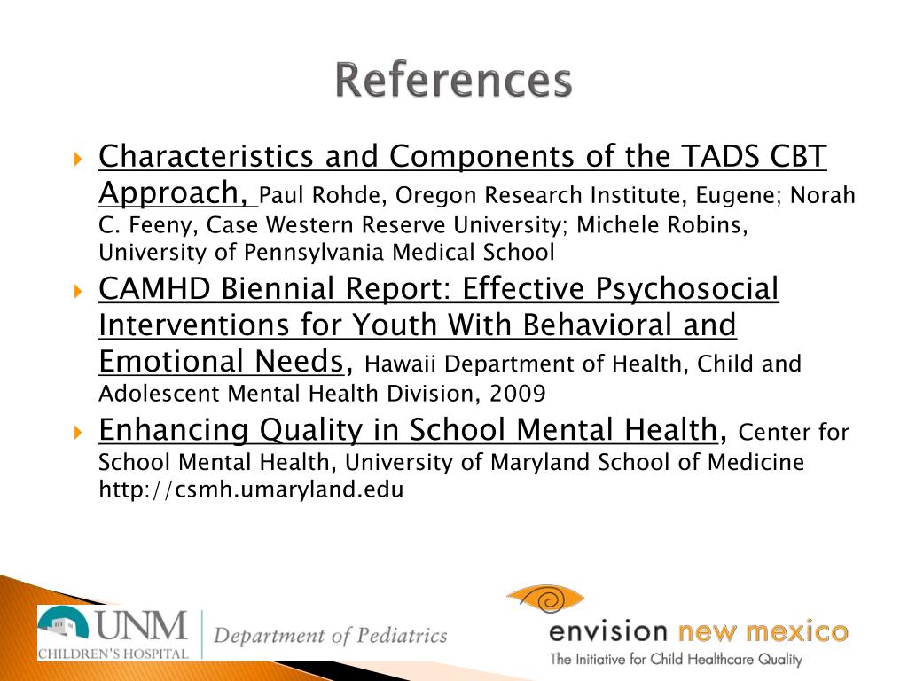 References • Characteristics and Components of the TADS CBT Approach, Paul Rohde, Oregon Research Institute, Eugene; Norah C. Feeny, Case Western Reserve University; Michele Robins, University of Pennsylvania Medical School • CAMHD Biennial Report: Effective Psychosocial Interventions for Youth With Behavioral and Emotional Needs, Hawaii Department of Health, Child and Adolescent Mental Health Division, 2009 • Enhancing Quality in School Mental Health, Center for School Mental Health, University of Maryland School of Medicine http://csmh.umaryland.edu