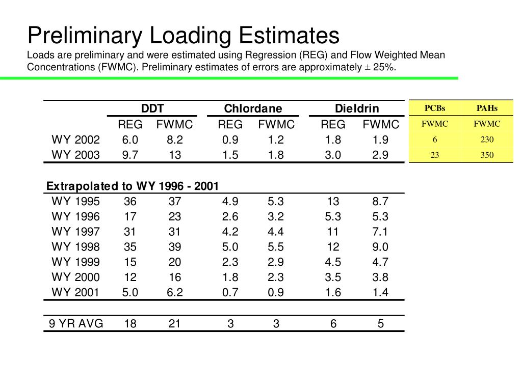 Preliminary Loading EstimatesLoads are preliminary and were estimated using Regression (REG) and Flow Weighted Mean Concentrations (FWMC). Preliminary estimates of errors are approximately ± 25%.