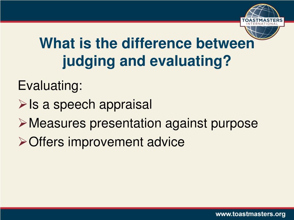 What is the difference between judging and evaluating? Evaluating: • Is a speech appraisal • Measures presentation against purpose • Offers improvement advice