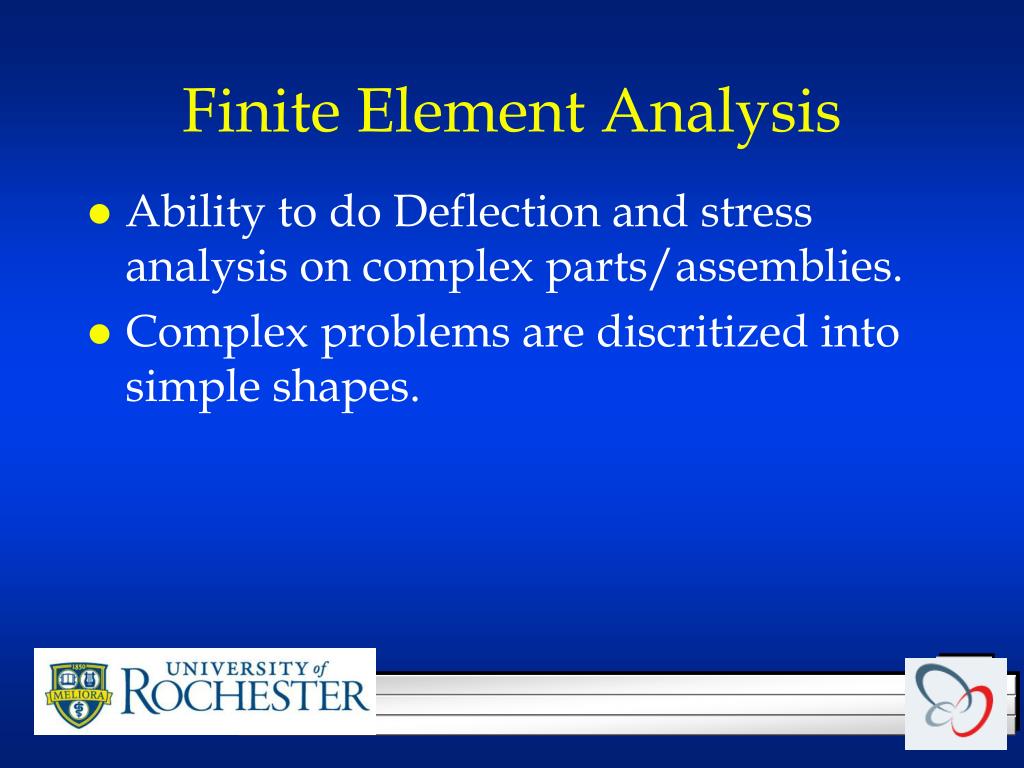 Finite Element Analysis • Ability to do Deflection and stress analysis on complex parts/assemblies. • Complex problems are discritized into simple shapes.
