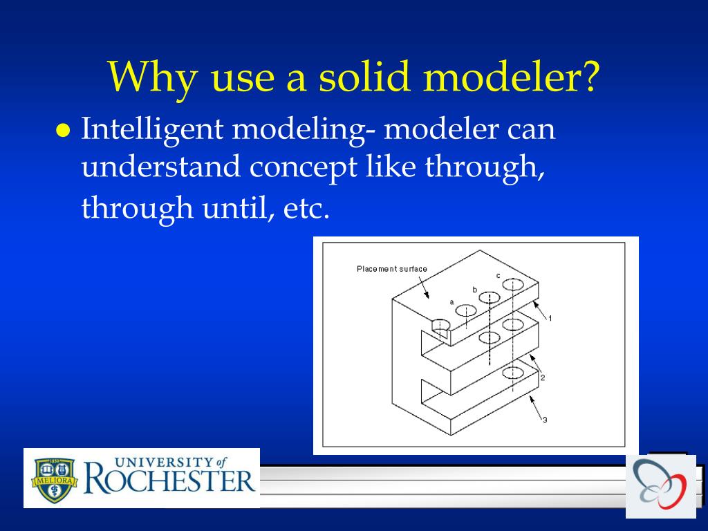 Why use a solid modeler? • Intelligent modeling- modeler can understand concept like through, through until, etc.