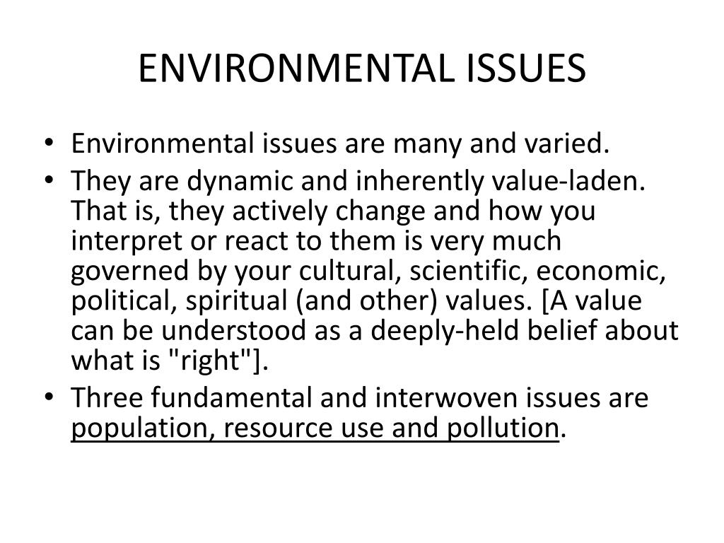 ENVIRONMENTAL ISSUES • Environmental issues are many and varied. • They are dynamic and inherently value-laden. That is, they actively change and how you interpret or react to them is very much governed by your cultural, scientific, economic, political, spiritual (and other) values. [A value can be understood as a deeply-held belief about what is "right"]. • Three fundamental and interwoven issues are population, resource use and pollution.