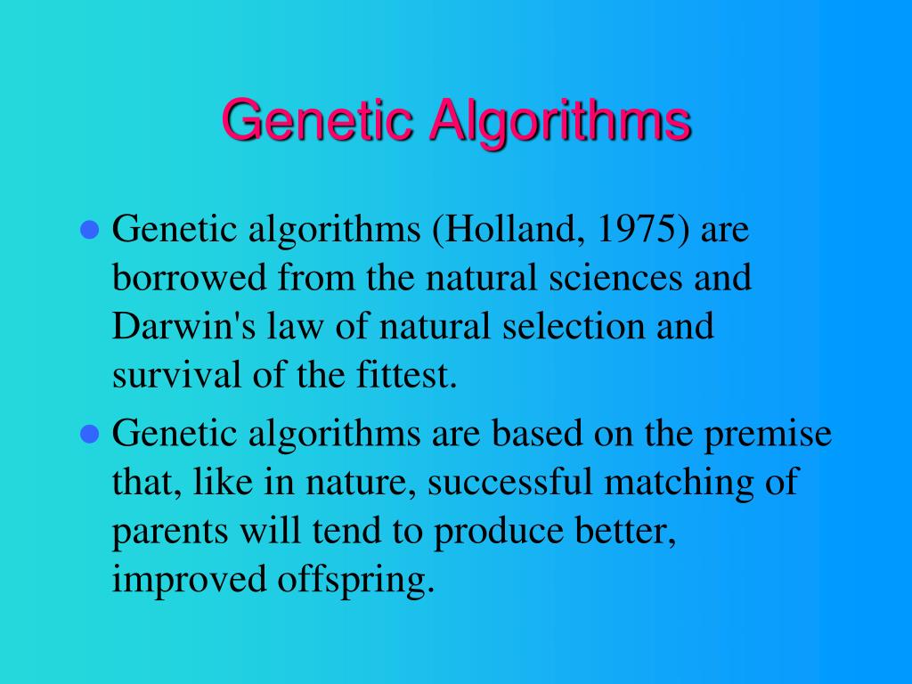 Genetic Algorithms • Genetic algorithms (Holland, 1975) are borrowed from the natural sciences and Darwin's law of natural selection and survival of the fittest. • Genetic algorithms are based on the premise that, like in nature, successful matching of parents will tend to produce better, improved offspring.