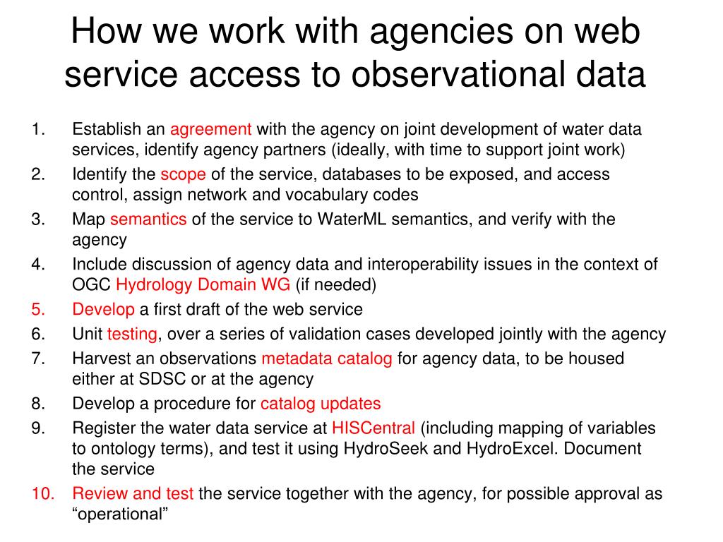 How we work with agencies on web service access to observational data • Establish an agreement with the agency on joint development of water data services, identify agency partners (ideally, with time to support joint work) • Identify the scope of the service, databases to be exposed, and access control, assign network and vocabulary codes • Map semantics of the service to WaterML semantics, and verify with the agency • Include discussion of agency data and interoperability issues in the context of OGC Hydrology Domain WG (if needed) • Develop a first draft of the web service • Unit testing, over a series of validation cases developed jointly with the agency • Harvest an observations metadata catalog for agency data, to be housed either at SDSC or at the agency • Develop a procedure for catalog updates • Register the water data service at HISCentral (including mapping of variables to ontology terms), and test it using HydroSeek and HydroExcel. Document the service • Review and test the service together with the agency, for possible approval as “operational”