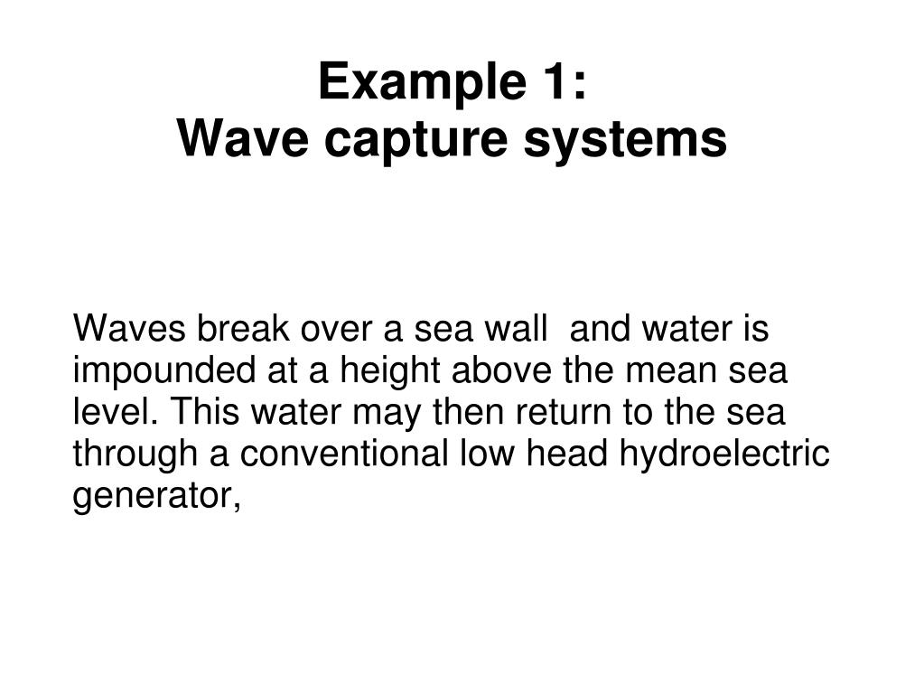 Example 1: Wave capture systems Waves break over a sea wall and water is impounded at a height above the mean sea level. This water may then return to the sea through a conventional low head hydroelectric generator,
