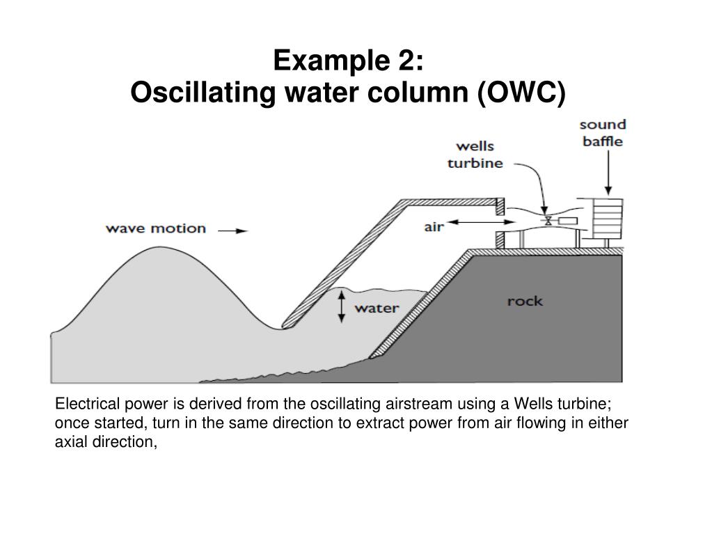 Example 2:Oscillating water column (OWC) Electrical power is derived from the oscillating airstream using a Wells turbine; once started, turn in the same direction to extract power from air flowing in either axial direction,