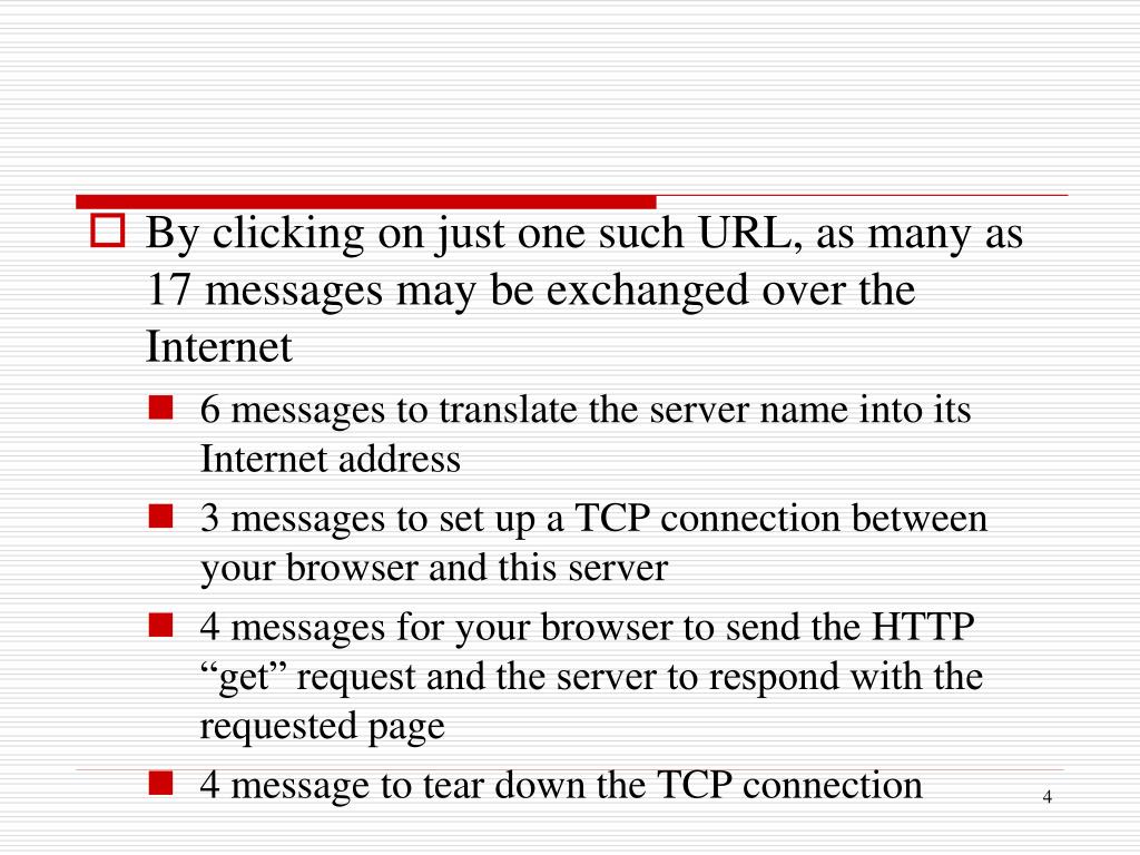 By clicking on just one such URL, as many as 17 messages may be exchanged over the Internet • 6 messages to translate the server name into its Internet address • 3 messages to set up a TCP connection between your browser and this server • 4 messages for your browser to send the HTTP “get” request and the server to respond with the requested page • 4 message to tear down the TCP connection