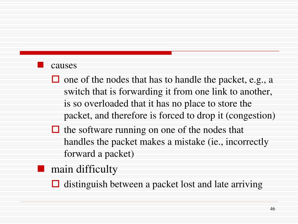 causes • one of the nodes that has to handle the packet, e.g., a switch that is forwarding it from one link to another, is so overloaded that it has no place to store the packet, and therefore is forced to drop it (congestion) • the software running on one of the nodes that handles the packet makes a mistake (ie., incorrectly forward a packet) • main difficulty • distinguish between a packet lost and late arriving