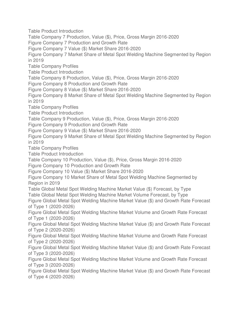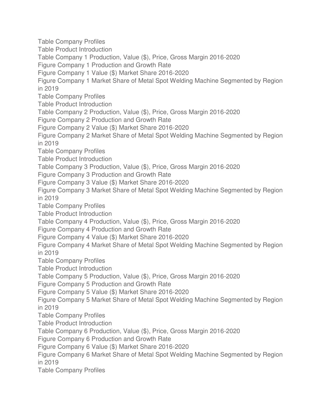 Table Company Profiles Table Product Introduction Table Company 1 Production, Value ($), Price, Gross Margin 2016-2020 Figure Company 1 Production and Growth Rate Figure Company 1 Value ($) Market Share 2016-2020 Figure Company 1 Market Share of Metal Spot Welding Machine Segmented by Region in 2019 Table Company Profiles Table Product Introduction Table Company 2 Production, Value ($), Price, Gross Margin 2016-2020 Figure Company 2 Production and Growth Rate Figure Company 2 Value ($) Market Share 2016-2020 Figure Company 2 Market Share of Metal Spot Welding Machine Segmented by Region in 2019 Table Company Profiles Table Product Introduction Table Company 3 Production, Value ($), Price, Gross Margin 2016-2020 Figure Company 3 Production and Growth Rate Figure Company 3 Value ($) Market Share 2016-2020 Figure Company 3 Market Share of Metal Spot Welding Machine Segmented by Region in 2019 Table Company Profiles Table Product Introduction Table Company 4 Production, Value ($), Price, Gross Margin 2016-2020 Figure Company 4 Production and Growth Rate Figure Company 4 Value ($) Market Share 2016-2020 Figure Company 4 Market Share of Metal Spot Welding Machine Segmented by Region in 2019 Table Company Profiles Table Product Introduction Table Company 5 Production, Value ($), Price, Gross Margin 2016-2020 Figure Company 5 Production and Growth Rate Figure Company 5 Value ($) Market Share 2016-2020 Figure Company 5 Market Share of Metal Spot Welding Machine Segmented by Region in 2019 Table Company Profiles Table Product Introduction Table Company 6 Production, Value ($), Price, Gross Margin 2016-2020 Figure Company 6 Production and Growth Rate Figure Company 6 Value ($) Market Share 2016-2020 Figure Company 6 Market Share of Metal Spot Welding Machine Segmented by Region in 2019 Table Company Profiles