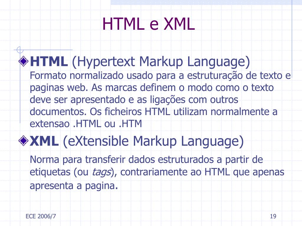 HTML e XML • HTML (Hypertext Markup Language) Formato normalizado usado para a estruturação de texto e paginas web. As marcas definem o modo como o texto deve ser apresentado e as ligações com outros documentos. Os ficheiros HTML utilizam normalmente a extensao .HTML ou .HTM • XML (eXtensible Markup Language) Norma para transferir dados estruturados a partir de etiquetas (ou tags), contrariamente ao HTML que apenas apresenta a pagina.