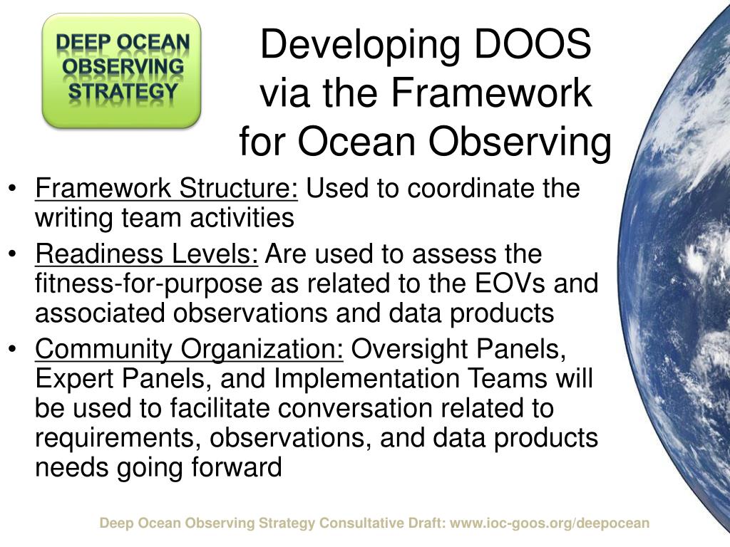 Developing DOOS via the Framework for Ocean Observing Deep Ocean Observing Strategy • Framework Structure: Used to coordinate the writing team activities • Readiness Levels: Are used to assess the fitness-for-purpose as related to the EOVs and associated observations and data products • Community Organization: Oversight Panels, Expert Panels, and Implementation Teams will be used to facilitate conversation related to requirements, observations, and data products needs going forward Deep Ocean Observing Strategy Consultative Draft: www.ioc-goos.org/deepocean