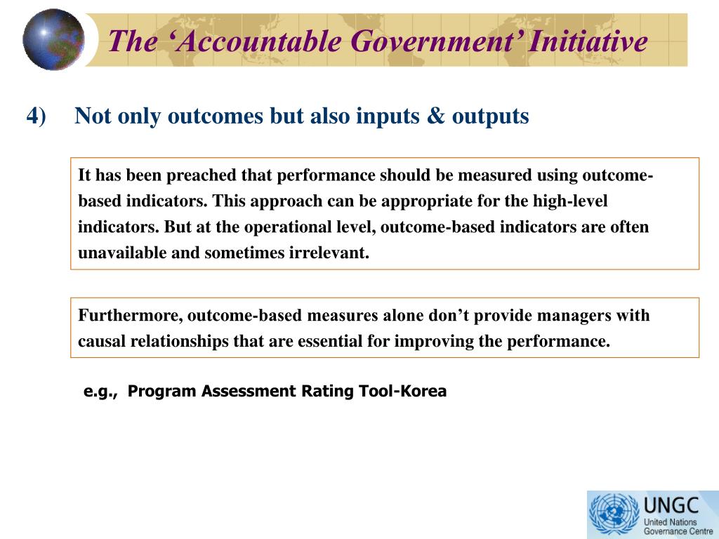 The ‘Accountable Government’ Initiative Not only outcomes but also inputs & outputs It has been preached that performance should be measured using outcome-based indicators. This approach can be appropriate for the high-level indicators. But at the operational level, outcome-based indicators are often unavailable and sometimes irrelevant. Furthermore, outcome-based measures alone don’t provide managers with causal relationships that are essential for improving the performance. e.g., Program Assessment Rating Tool-Korea