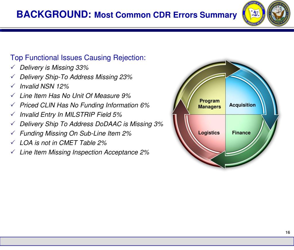 BACKGROUND: Most Common CDR Errors Summary Top Functional Issues Causing Rejection: • Delivery is Missing 33% • Delivery Ship-To Address Missing 23% • Invalid NSN 12% • Line Item Has No Unit Of Measure 9% • Priced CLIN Has No Funding Information 6% • Invalid Entry In MILSTRIP Field 5% • Delivery Ship To Address DoDAAC is Missing 3% • Funding Missing On Sub-Line Item 2% • LOA is not in CMET Table 2% • Line Item Missing Inspection Acceptance 2% Program Managers Acquisition Logistics Finance